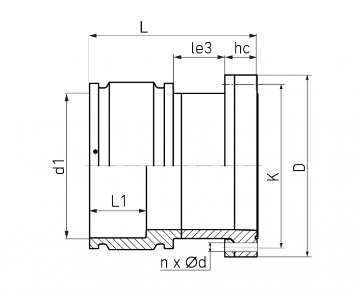 Art. No. | DN [mm] | d1 [mm] | D [mm] | le3 [mm] | L [mm] | L1 [mm] | z1 [mm] | K [mm] | n | ød [mm] | hC [mm] | kg |