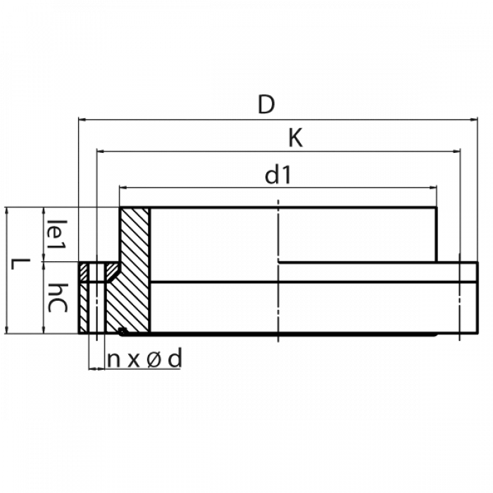 Art. No. | DN [mm] | d1 [mm] | D [mm] | le1 [mm] | L [mm] | K [mm] | n | ød [mm] | hC [mm] | kg |