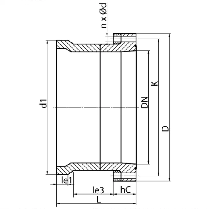 Art. No. | DN [mm] | d1 [mm] | D [mm] | le1 [mm] | le3 [mm] | L [mm] | K [mm] | n | ød [mm] | hC [mm] | kg |