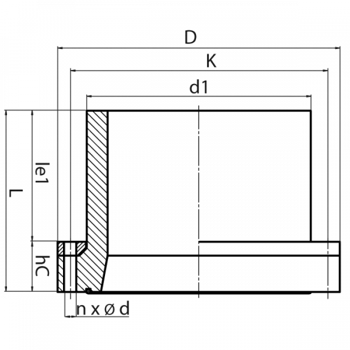 | Art. No. | DN [mm] | d1 [mm] | D [mm] | le1 [mm] | L [mm] | K [mm] | n | ød [mm] | hC [mm] | kg |